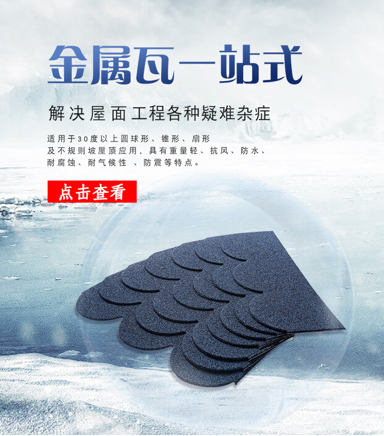 金屬魚鱗瓦表面顯圓錐凸感,高檔、雅致,復(fù)古中帶有現(xiàn)代感,淡雅含蓄,細膩天成,立體感強。適用于30°以上的圓球形、錐形、扇形及不規(guī)則坡屋頂?shù)膽?yīng)用